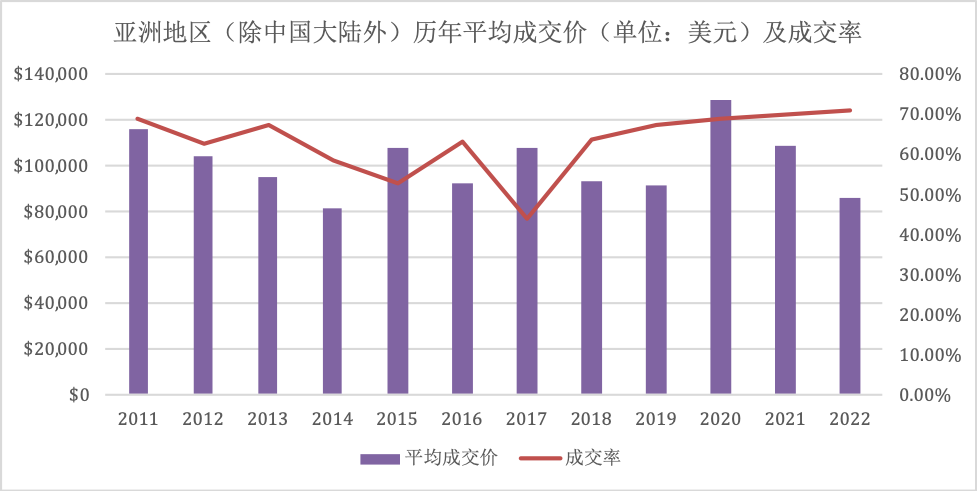 亚洲地区(除中国内地外)历年平均成交价(单位:美元)及成交率