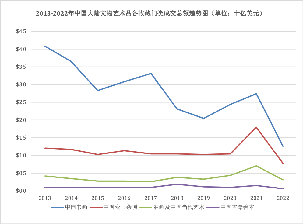 2013-2022年中国内地文物艺术品各收藏门类成交总额趋势图(单位:十亿美元)