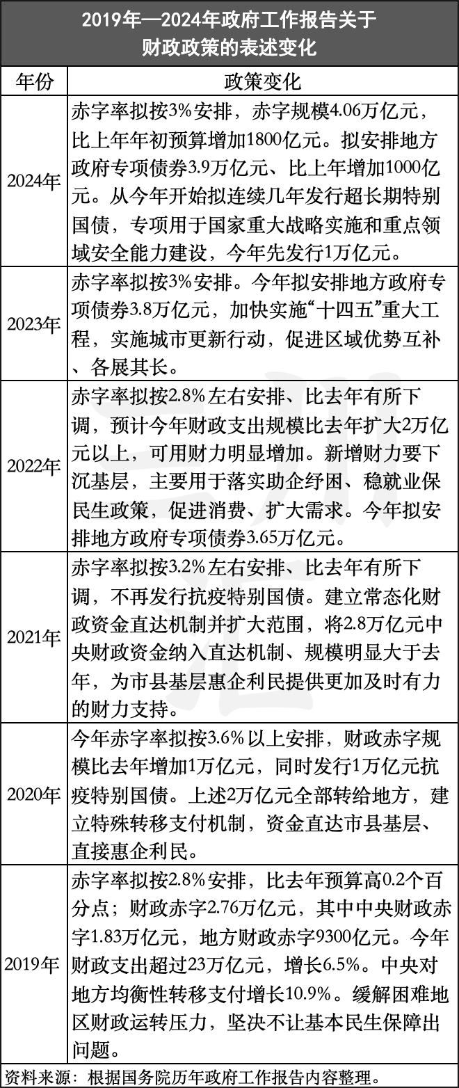 回顾对比2019年以来政府工作报告相关表述可以发现,我国财政政策逐步从缓解困难地区财政运转压力及解决基本民生保障,向助企纾困、稳就业、保民生以及促进消费等重点领域平衡发力。而2024年的财政政策支持重点转向了国家重点战略及重大项目建设等领域,不仅能够有效推动重点领域锻长板、补短板,还能更好地促进高质量发展和经济转型升级。